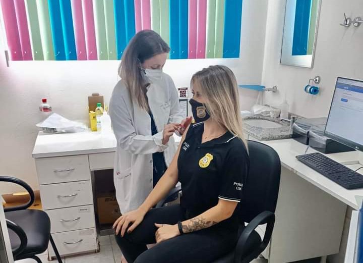 Em ação realizada no ESF São José os cerca de 30 profissionais da Polícia Civil, Brigada Militar e do Corpo de Bombeiros foram vacinados Apenas um profissional transferido recentemente para o município aguarda o intervalo de 4 meses para aplicação da 3ª dose.