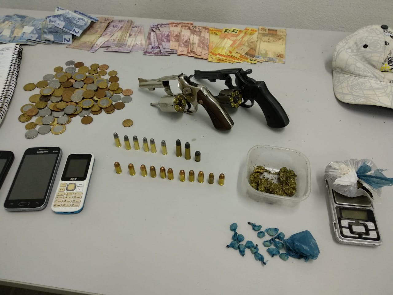 Foram apreendidos, 3 celulares, uma balança de precisão, caderno de anotações, revólver calibre 38, marca Rossi, com numeração suprimida. Outro revólver calibre 32, marca Doberman. Além das armas foram aprendidas 7 munições cal .38; 13 munições cal .32; 12 munições cal .380; mais de R$ 500 em dinheiro e ver de 80g em drogas, sendo maconha e crack.