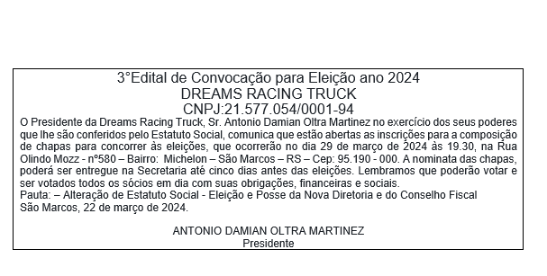 3º Edital de Convocação para Eleição ano 2024 Dreams Racing Truck . Atualizado em 22/03/2024 às 09:03, por Equipe SMO. Serra Gaúcha Leia também: Bombeiros e Resgate Mergulhadores resgataram corpo de vítima de afogamento na cachoeira do Rio São Marcos nesta sexta-feira Morador de Caxias do Sul se afogou na Cascata de São Roque, nas margens da Rota Saonda na divisa com Caxias do Sul Polícia e Segurança Bombeiros realizam buscas por jovem desaparecido na cachoeira do Rio São Marcos Local é frequentado por banhistas em dias de calor e todos os anos registra óbitos por afogamento Social LEO Clube lança campanha NATALEO para arrecadação de brinquedos A ação mobiliza escolas, empresas e comunidade para garantir um Natal mais alegre às crianças são-marquenses Negócios e Economia Receita abre consulta a lote da malha fina do Imposto de Renda Cerca de 214 mil contribuintes receberão R$ 494,09 milhões