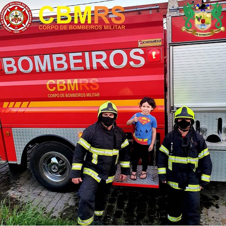 Ao ser convidado à conhecer o caminhão dos bombeiros, o menino vestiu sua roupa de super herói e correu até a guarnição para bater algumas fotos com os soldados Busnelo e Vaz.