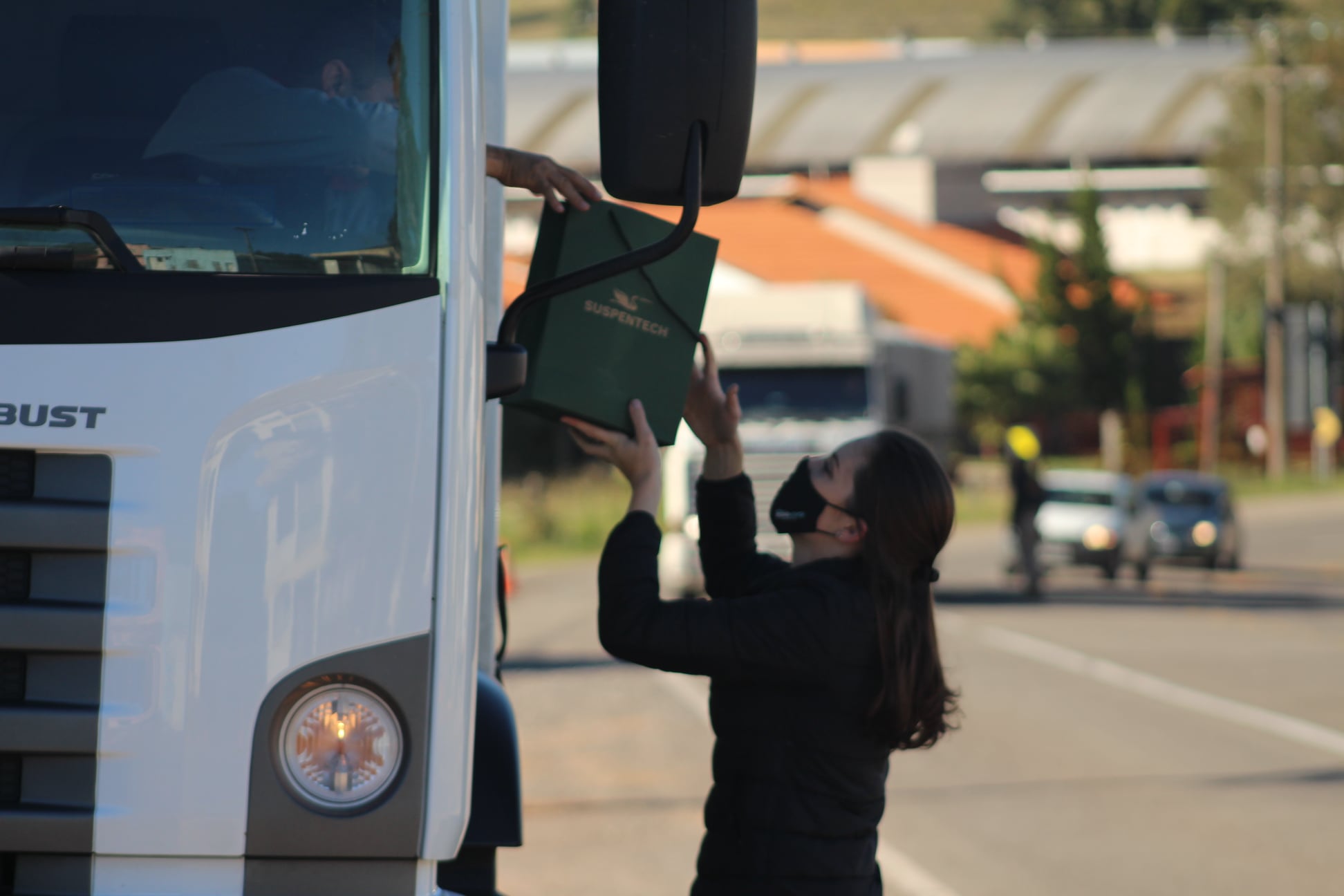 Movimento entre empresas chama atenção para demandas do setor. Os kits com máscaras, álcool gel, alimentos e brindes foram entregues no km 112 da BR-116