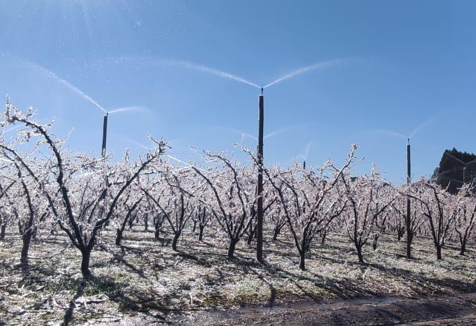 Ele explica que quando a temperatura do ar cair bruscamente, atingindo cerca de 3°C em noite de céu claro, a aplicação de água por aspersão deve ser ligada e mantida durante a noite e o início da manhã, até o completo descongelamento, que pode ocorrer entre 9 e 11h da manhã. A lâmina aplicada deve ser de 2 a 6 mm/hora, aumentando de acordo com a intensidade do frio.