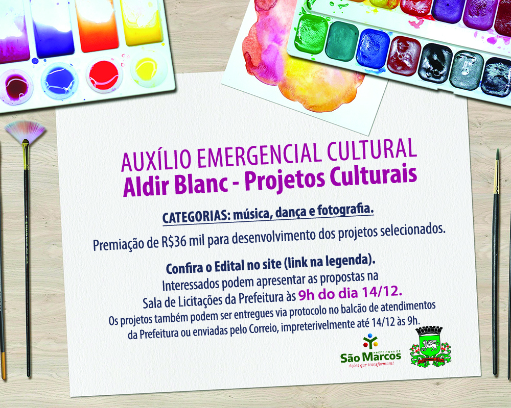 Cada projeto selecionado irá receber R$6mil para ser realizado no município de São Marcos A Secretaria de Cultura, Desporto e Turismo publicou hoje (03) edital com as informações de processo seletivo para eleger os projetos culturais que serão contemplados a partir da aplicação dos recursos do inciso III da lei federal 14.017 (Lei Aldir Blanc).