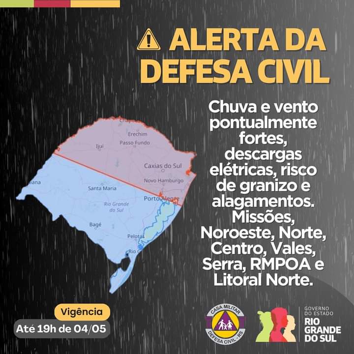 O alerta permanecerá válido até as 19h deste sábado. A Defesa Civil emitiu um alerta para a possibilidade de chuvas intensas, ventos pontualmente fortes, descargas elétricas, risco de granizo e alagamentos para Missões, Noroeste, Norte, Centro, Vales, Serra, Região Metropolitana de Porto Alegre e Litoral Norte. O alerta permanecerá válido até as 19h do sábado.
