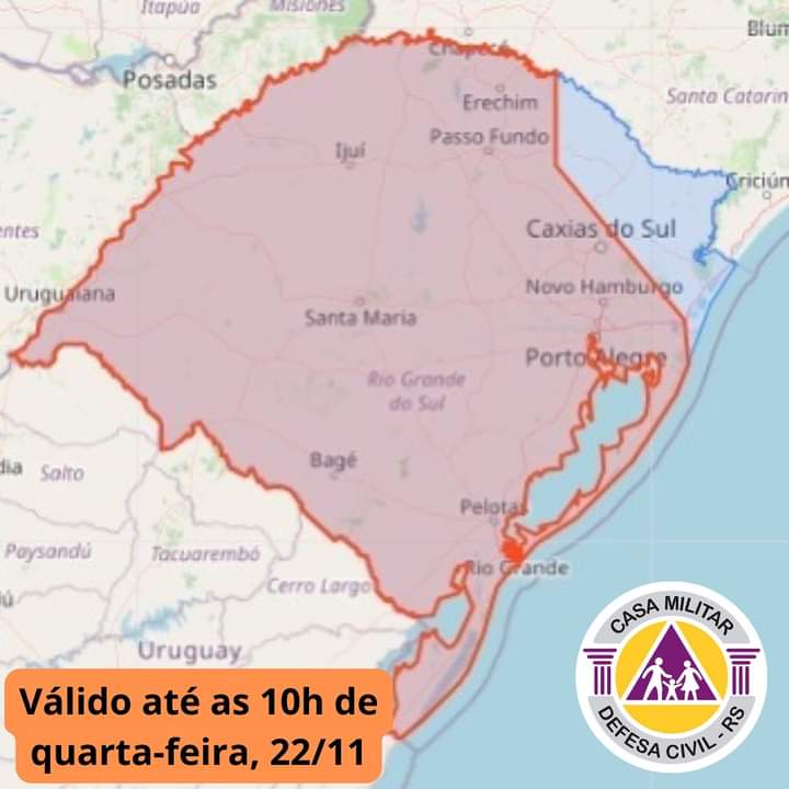 Alerta válido até às 10 horas desta quarta-feira (22) Por volta das 20h30 desta terça-feira (21) a Defesa Civil emitiu um alerta crucial para a área destacada em vermelho no mapa, válido até as 10h de quarta-feira, 22 de novembro.