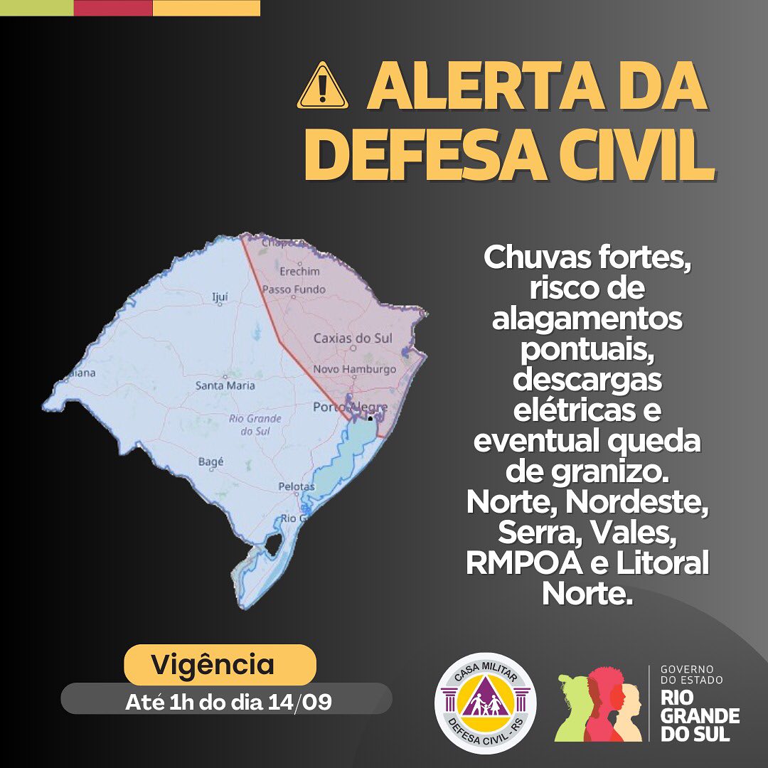 A Defesa Civil emitiu um alerta para chuvas fortes com risco de alagamentos pontuais, descargas elétricas e possível queda de granizo nas regiões Norte, Nordeste, Serra, Vales, Litoral Norte e na Região Metropolitana de Porto Alegre. O aviso é válido até a 1h deste sábado (14), e a população deve adotar medidas de segurança.