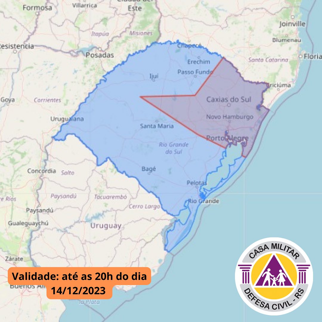 A Defesa Civil emitiu um alerta para a área destacada em vermelho no mapa, válido até as 20h. São previstas chuvas intensas, ventos pontualmente fortes, descargas elétricas, eventual queda de granizo e vento forte. Em caso de emergência, ligue para os números 190/193.