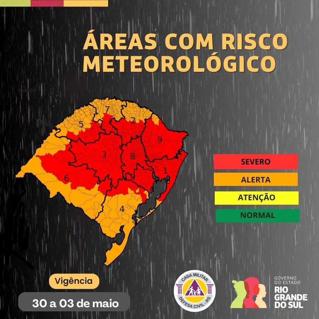 Para esta quarta-feira (1/5), a previsão indica continuidade das chuvas intensas em áreas como a metade Sul, Missões, Centro, Vales, Região Metropolitana de Porto Alegre, Serra e Litoral