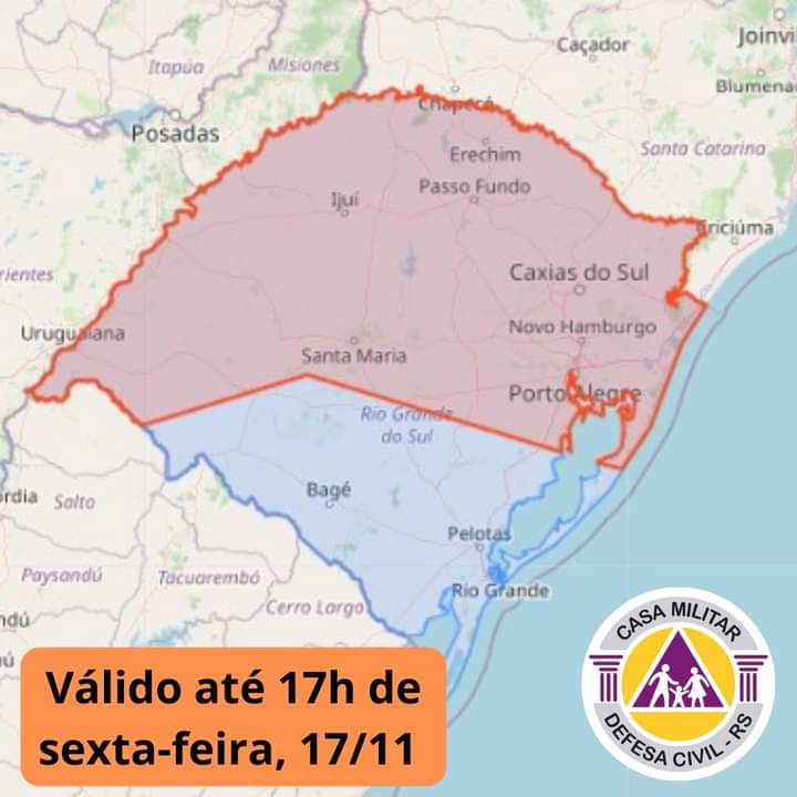 O aviso é válido até as 17h desta sexta-feira, 17 de novembro. A Defesa Civil emitiu um alerta para a possibilidade de chuvas e ventos intensos, descargas elétricas e eventual queda de granizo na área demarcada em vermelho no mapa. O aviso é válido até as 17h desta sexta-feira, 17 de novembro.