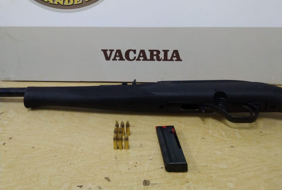 Diante dos fatos o mesmo foi conduzido, juntamente com a arma de fogo apreendida, e apresentados na Delegacia de Polícia de Pronto Atendimento de Vacaria onde foi constatado que o Rifle estava em situação de furto em Caxias do Sul.