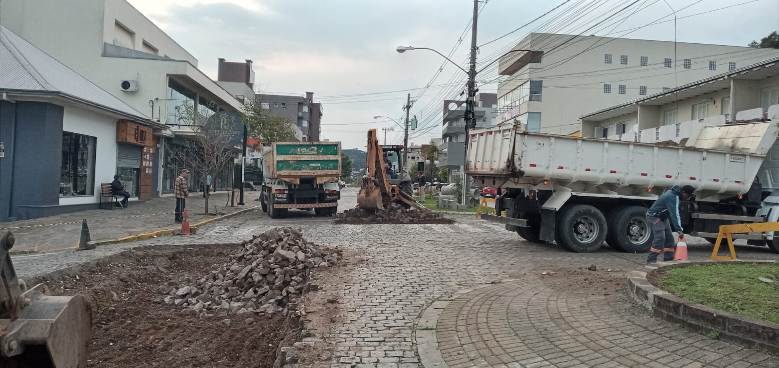 Prefeitura iniciou hoje a remoção dos paralelepípedos entre as ruas da Vitória e a João Carlos Gasparotto; trecho é o último dos três propostos pela administração nesta empreitada