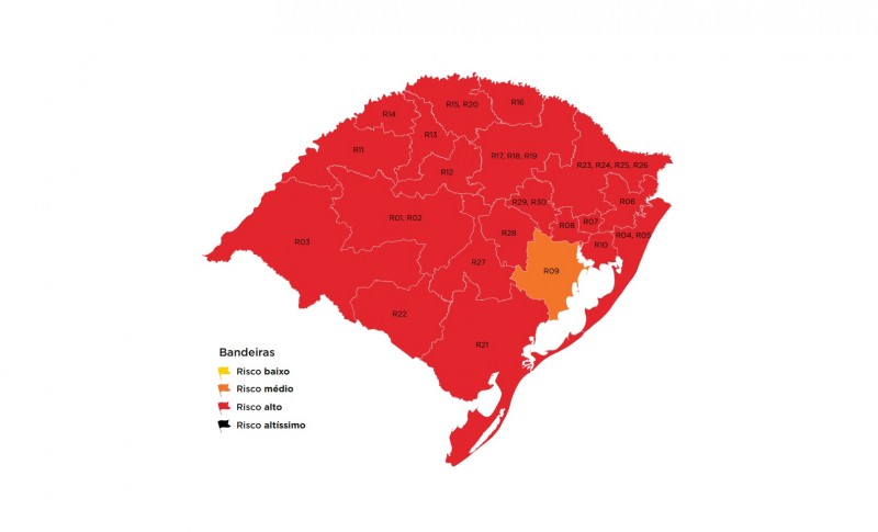 Nesta rodada, a única região Covid que não apresenta risco alto de contágio é Guaíba, classificada em bandeira laranja (risco epidemiológico médio). As outras 20 regiões estão em bandeira vermelha.