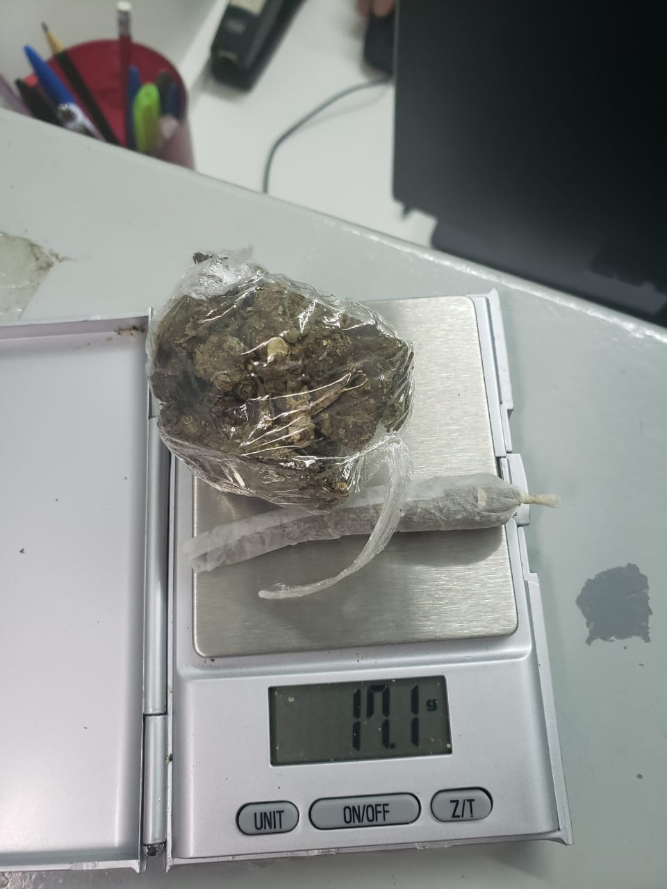 A guarnição realizou a abordagem do mesmo e localizou no bolso direito de sua bermuda um cigarro de maconha. Momentos antes da abordagem o indivíduo dispensou algo na rua, aonde foi localizada uma porção pesando 17 gramas da mesma substância embaixo de um veículo.