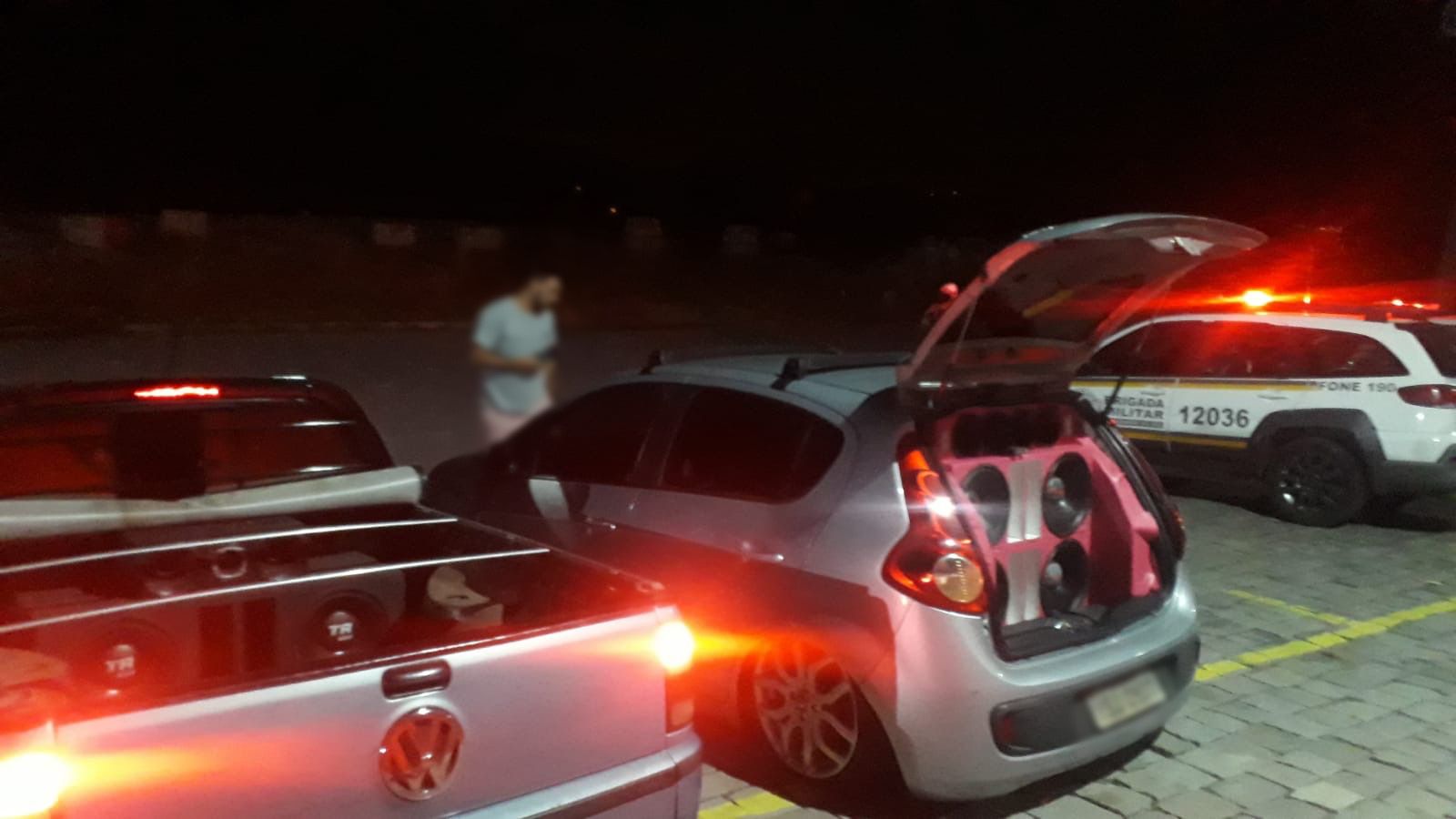 No local a polícia constatou que um veículo Fiat Palio estava com o porta-malas aberto ao lado de uma VW Saveiro, ambos com equipamentos de som robusto e em alto volume.
