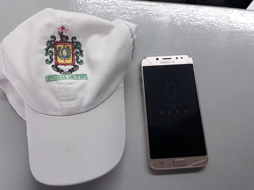 Após revista pessoal foi encontrado com o mesmo um aparelho celular com as características informadas (SAMSUNG J7 de cor prata). Através do número do IMEI, comprovou tratar-se do celular roubado.