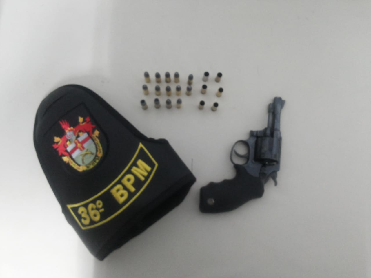Diante da suspeita a BM fez a abordagem e durante busca pessoal localizou na cintura do mesmo um coldre com um revólver marca Taurus, calibre 32 com 5 munições intactas no tambor, também no coldre haviam 9 munições intactas e 6 deflagradas.