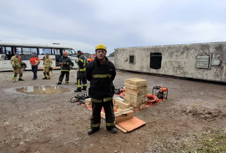 Deivid Benner passou por treinamento em salvamento veicular pesado e extração de vítimas em ônibus, promovido pelo CBMRS