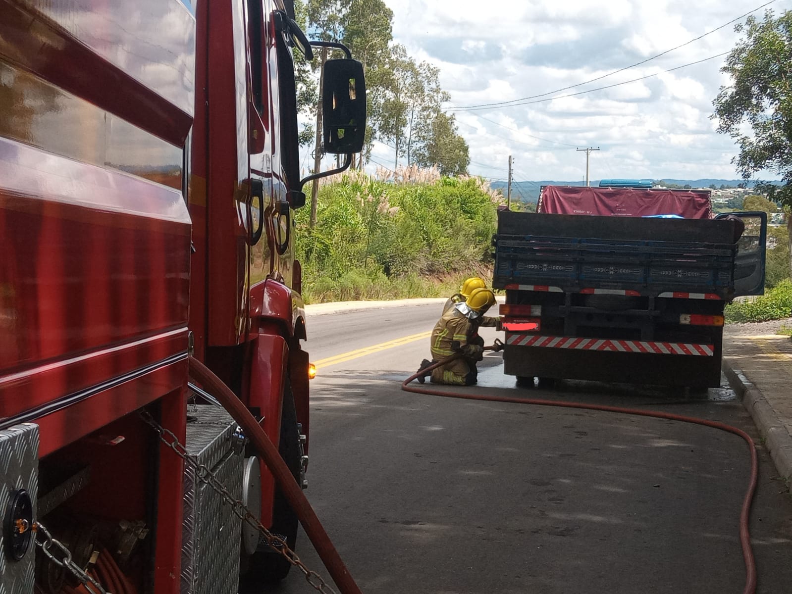 Os bombeiros montaram uma linha de mangueiras e resfriaram o cubo de roda do veículo, onde as chamas haviam iniciado. Ninguém ficou ferido.