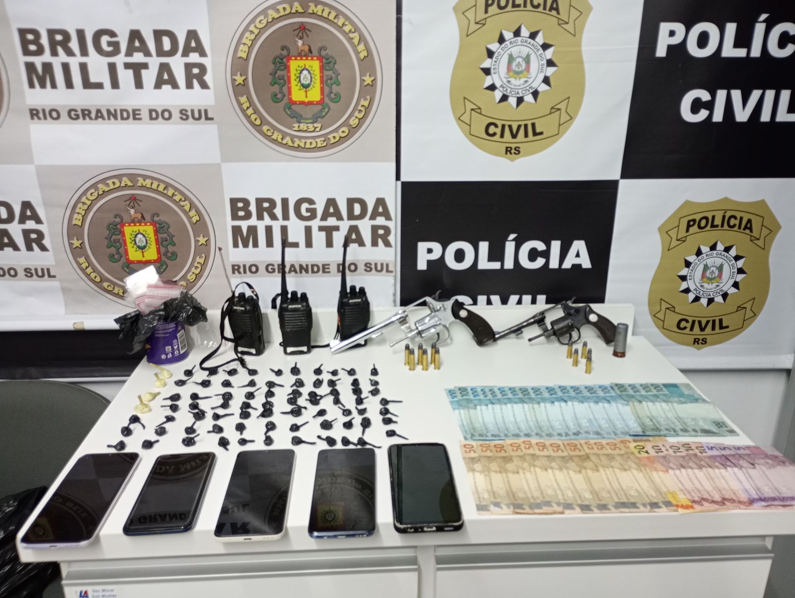 Com o indivíduo de 19 anos, as autoridades encontraram um revólver calibre .38 com numeração raspada, municiado com seis cartuchos prontos para uso. Além disso, ele portava 77 porções de cocaína já embaladas para venda e R$ 2.448 em dinheiro. Já com o adolescente, os policiais apreenderam um revólver calibre .32, carregado com cinco munições intactas, além de uma munição de calibre 12.