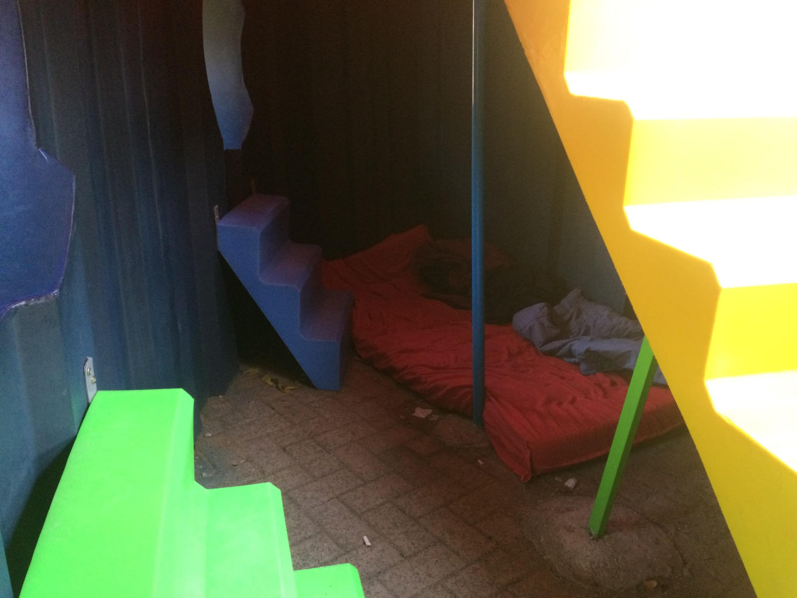 Não sabemos desde quando o colchão está no local. Contudo, a parte interna do brinquedo é pouco acessada pelos pais, que observam as crianças do lado de fora. Isso facilita o uso indevido de brinquedo infantil