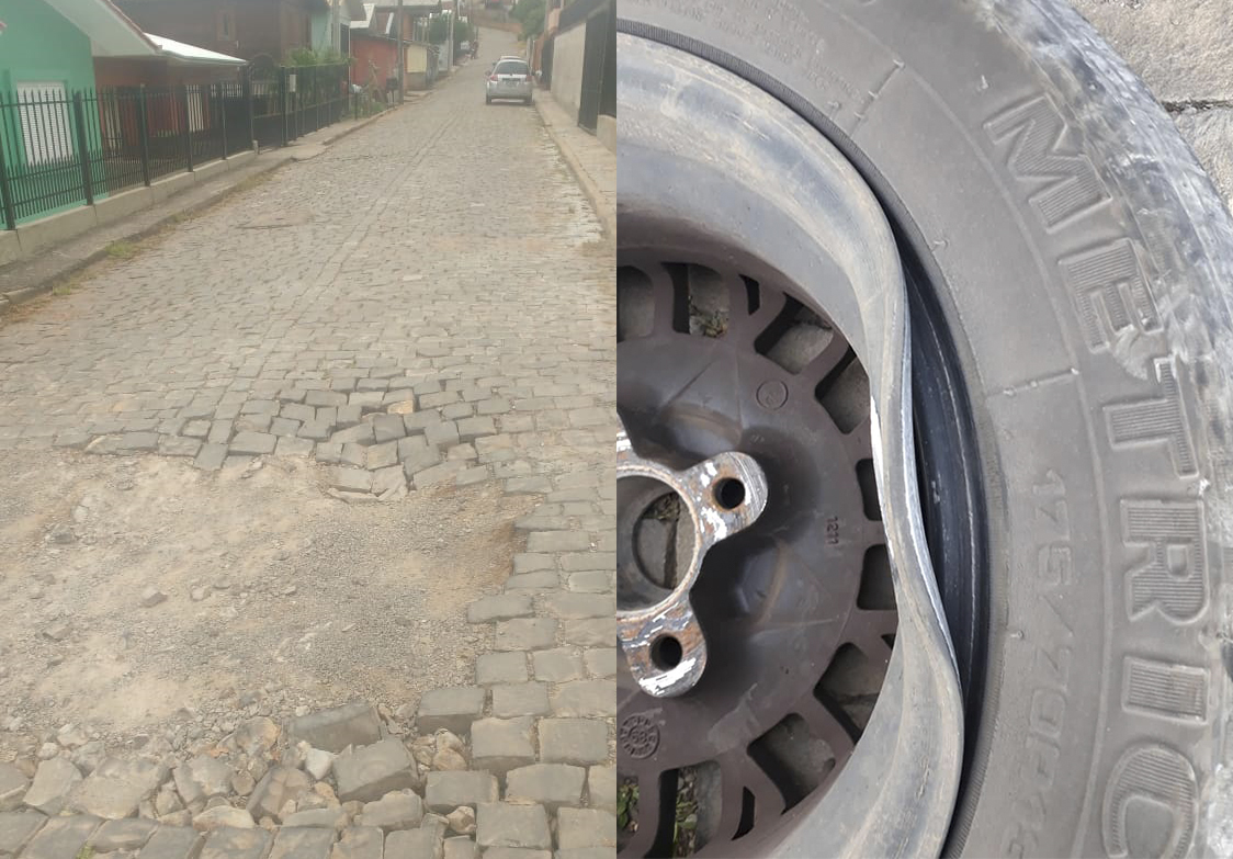 “Se foi a caixa de roda, entortou uma roda e lascou o para-choques, foi um prejuízo de mais de R$ 500” reclama Dionatan Bopsin, morador do Progresso, que usa o veículo para trabalhar e trafega pela Rua Joaquim Domingos Vanelli diariamente (fotos).
