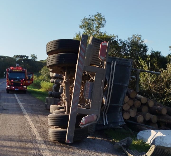 A Polícia Rodoviária Federal (PRF) atendeu um acidente na tarde desta segunda-feira, 16 de setembro, por volta das 16h40, no km 64 da BR-116, na ponte sobre o Rio Canabarro, em Campestre da Serra. Um caminhão, carregado com toras de pinus elliotti, tombou no local.