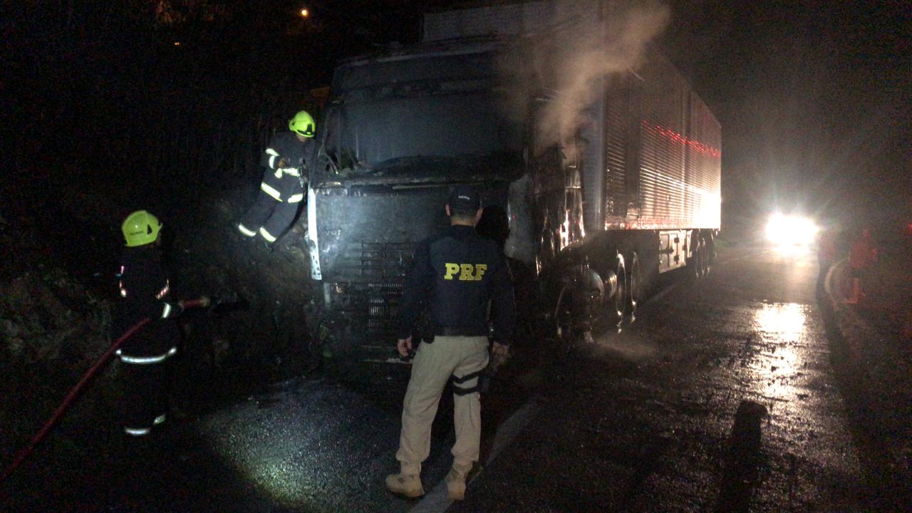 O caminhão Volvo teve a cabine totalmente destruída pelas chamas que foram controladas pelo Corpo de Bombeiros, evitando que a carreta fosse atingida.