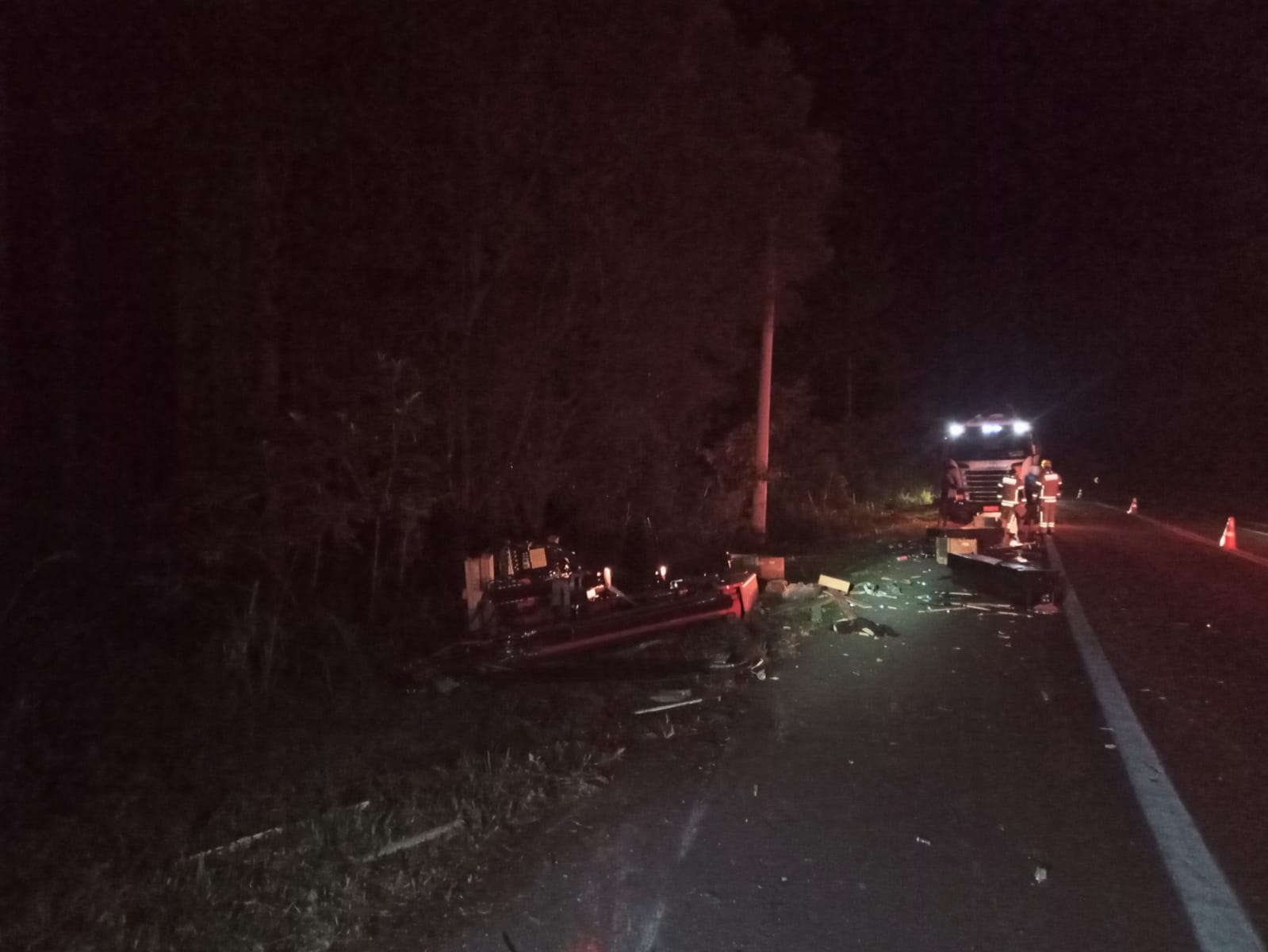 O caminhão transportava implementos e parte do material ficou sobre a pista logo após uma curva. Os bombeiros foram acionados e deslocaram com uma viatura resgate e um caminhão. Não houve feridos e a equipe atua na sinalização do trecho.