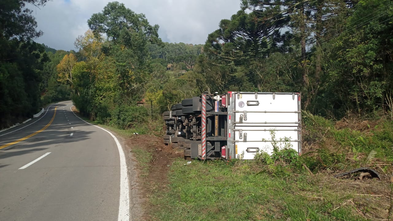 O veículo, com placas de São Marcos, tombou fora da via e o trânsito não chegou a ser interrompido. O caminhão estava vazio e o condutor não ficou ferido.