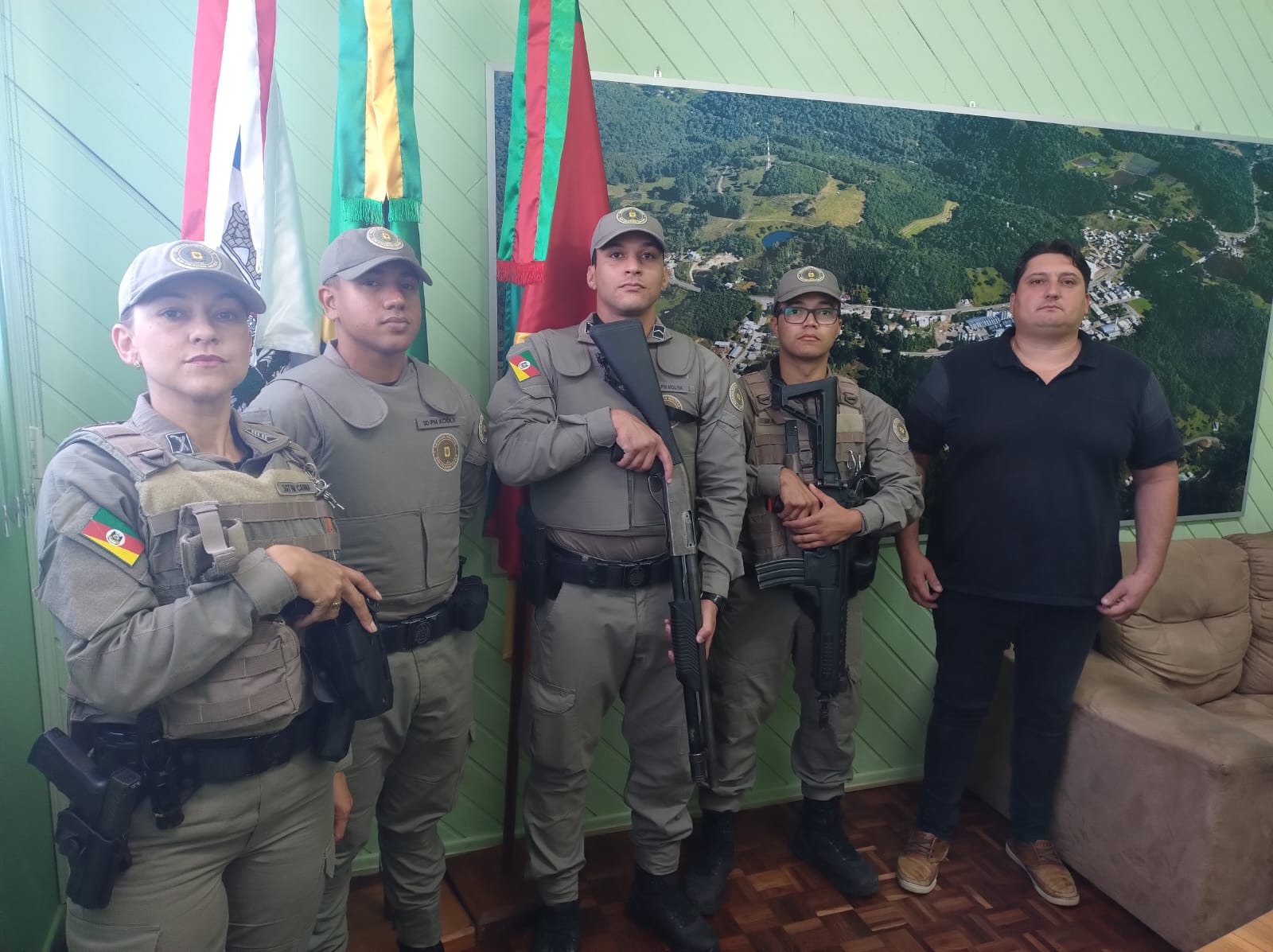 Na manhã desta segunda-feira (6/1), o prefeito Tairo Balardin recepcionou dois novos policiais militares que integrarão o efetivo da Brigada Militar em Campestre da Serra. A apresentação dos soldados Gerson Bezerra de Moura Júnior, natural de Alagoas, e Luís Eduardo Acioly de Freitas, do Ceará, foi conduzida pela comandante da corporação no município, sargento Carina Gonçalves de Aguiar.