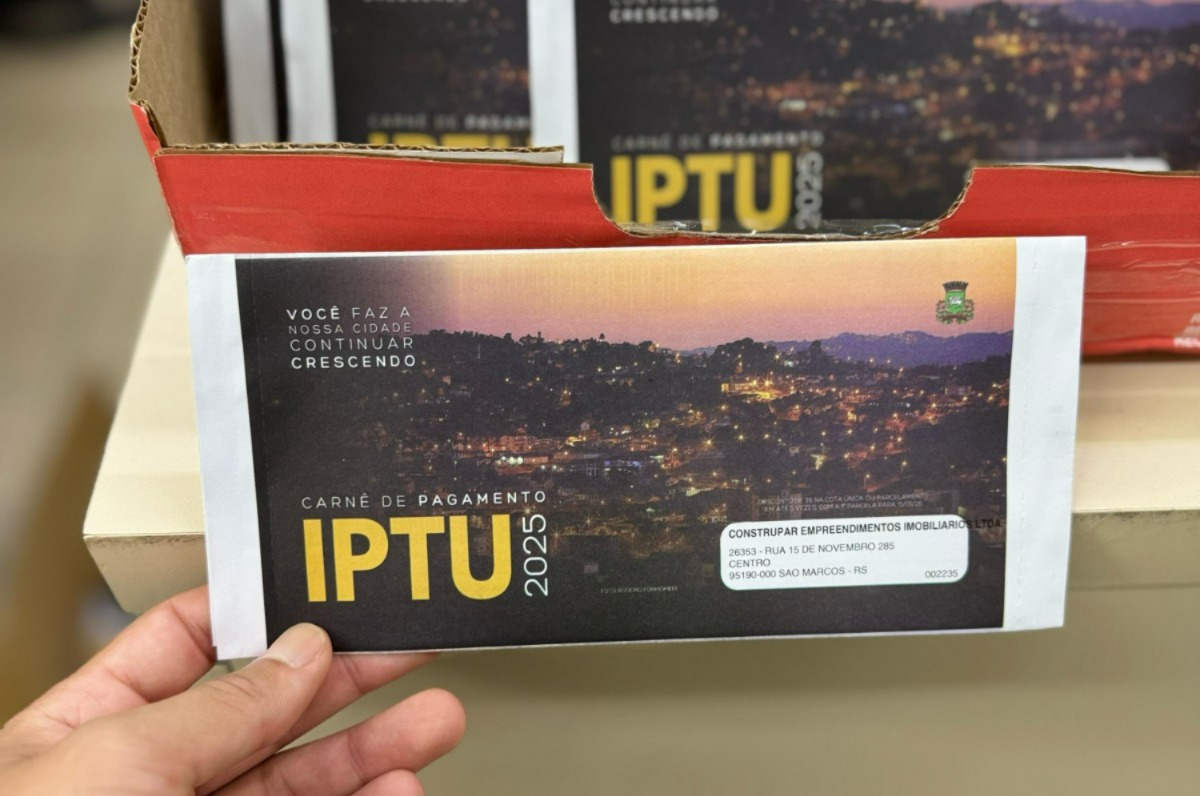 A Prefeitura de São Marcos anunciou que os carnês do Imposto Predial e Territorial Urbano (IPTU) 2024 chegaram da gráfica e começarão a ser distribuídos nos próximos dias pelos Correios. A primeira parcela, ou o pagamento em cota única com desconto para este ano, vence no dia 15 de maio.