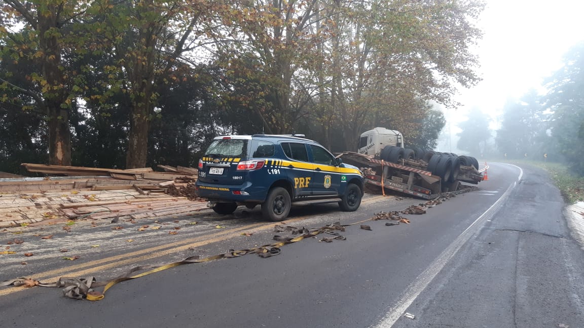 O trânsito é lento e flui em meia pista. A carga de madeira está espalhada em parte da rodovia e a PRF recomenda cuidado. O motorista não se feriu.