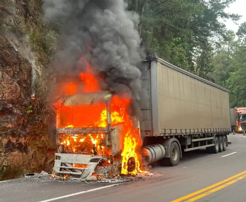 O motorista vinha do Paraná, não se feriu e houve apenas danos materiais.. A causa do incêndio ainda não foi identificada, e equipes permanecem no local para controlar a situação e avaliar os danos.