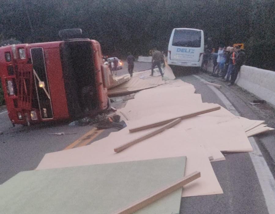 Carga de MDF ficou espalhada pela pista. O trânsito permanece totalmente bloqueado nos dois sentidos da rodovia, sem previsão de liberação. O caminhoneiro e alguns passageiros do coletivo sofreram ferimentos.