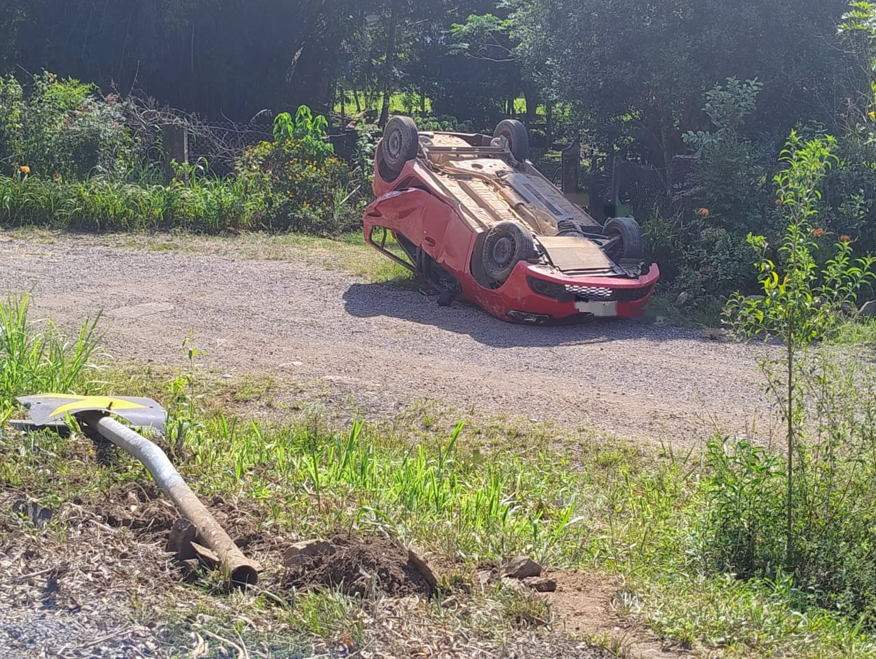 Na tarde desta segunda-feira , 3 de março, um carro saiu da pista e capotou no km 127 da BR-116, na localidade de Pedras Brancas, logo após a antiga praça de pedágio. O acidente envolveu um Renault Sandero, com placas de São Marcos, que acabou parando fora da rodovia, na entrada de uma residência, com as rodas viradas para cima.