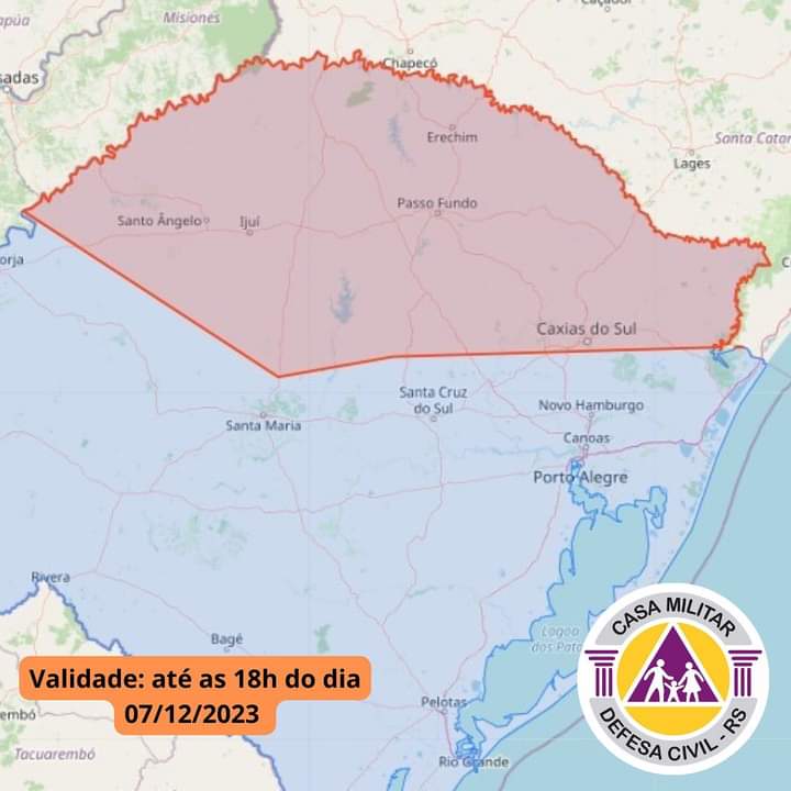 Alerta da Defesa Civil é válido na área em vermelho do mapa