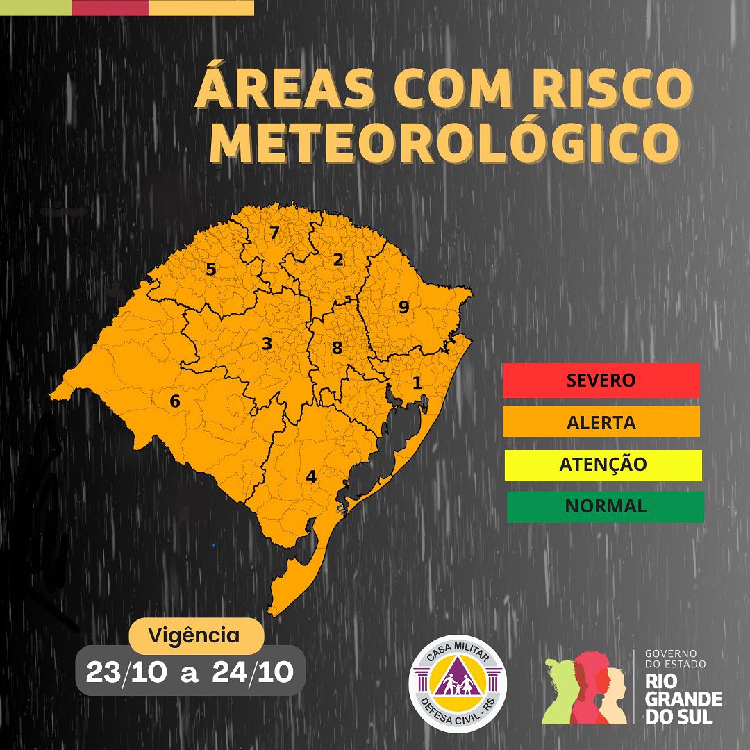 A Sala de Situação atualizou a previsão do tempo para os dias 23 e 24 de outubro, alertando para a formação de um ciclone extratropical que poderá causar chuvas intensas, temporais e ventos fortes em diversas regiões do Rio Grande do Sul.