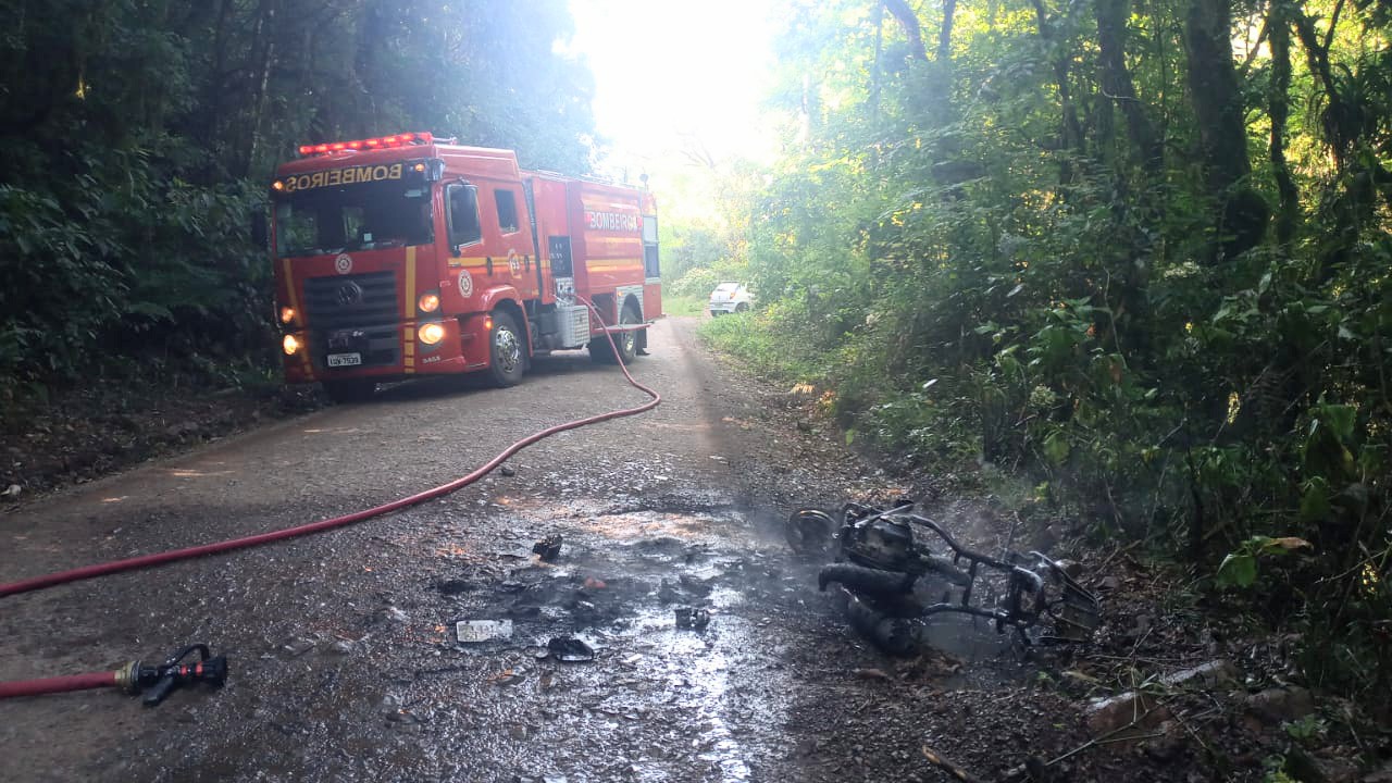 Motocicleta acabou pegando fogo após a queda Por volta das 8h30 desta quarta-feira as equipes de resgate do município foram acionadas para atender um acidente de trânsito na Estrada 500, em Santo Henrique, próximo a ponte do Rio São Marcos.