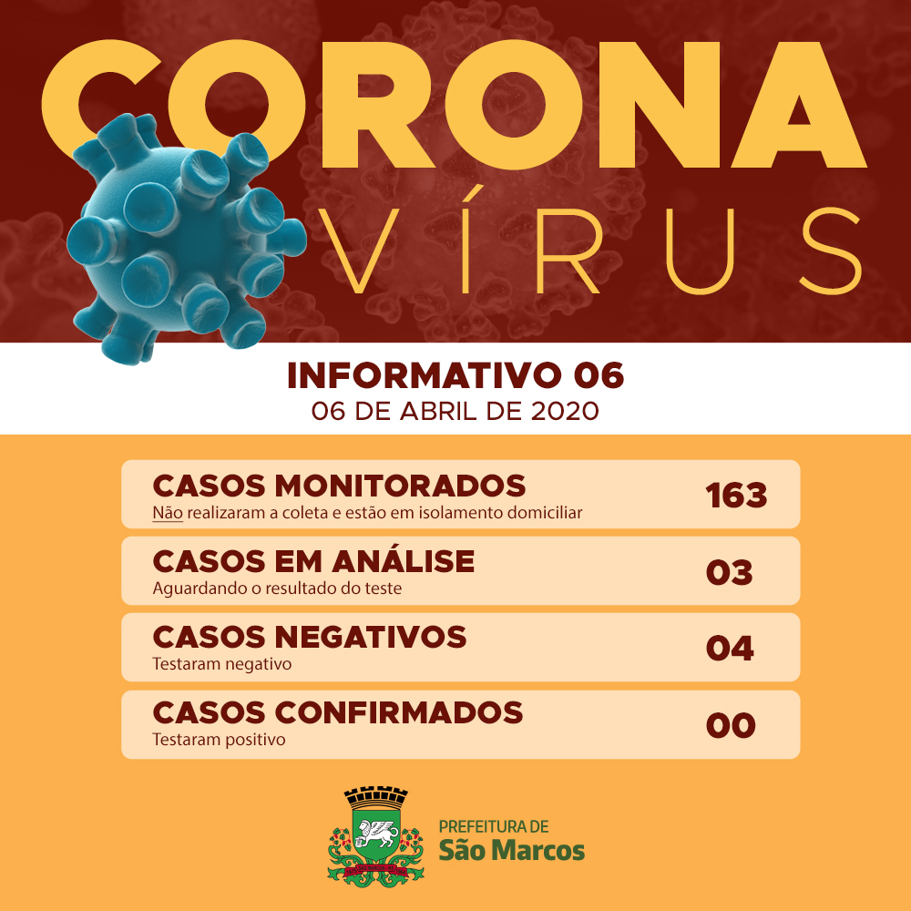 São Marcos aguarda ainda o resultado de outros três exames Os resultados de 3 testes que estavam em análise foram informados pelo Laboratório Central do Estado (LACEN) hoje (06). Todos foram negativos para o Coronavírus. Outros três pacientes aguardam o resultado do exame, desses, apenas um permanece em internação hospitalar (a internação ocorreu em 05/04/2020).