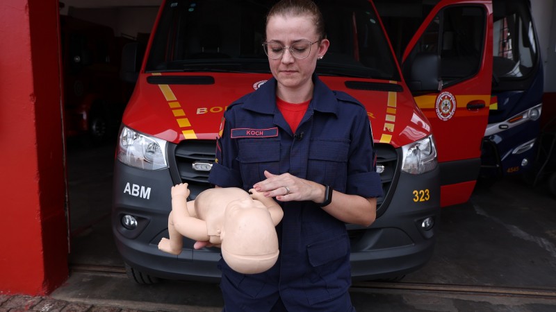 A soldado Koch, que integra o CBMRS e também é graduada em enfermagem, explica o passo a passo para o desengasgo de bebês. O processo envolve manobras específicas e exige alguns cuidados. Embora se trate de uma situação delicada, a primeira dica é manter a calma.