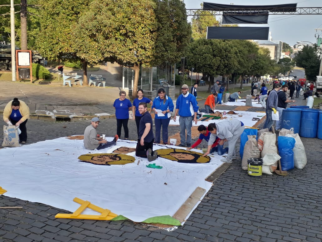 Desde a madrugada desta quinta-feira, mais de mil pessoas trabalham na confecção dos 48 tapetes de Corpus Christi no entorno da Praça Dante Marcucci. A tradição dos tapetes no município se destaca pela extensão e área compreendida pelas obras.