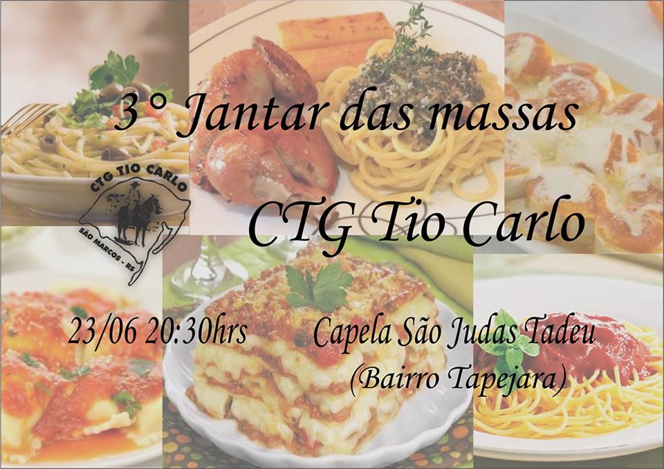 O CTG Tio Carlo, está promovendo a 3ª edição do Jantar das Massas no dia 23 de junho, sábado. O evento é dedicado aos apreciadores da culinária italiana e da boa gastronomia.