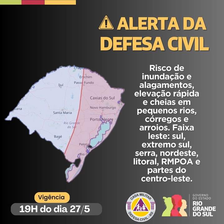 A Defesa Civil emitiu um alerta urgente sobre o risco iminente de inundação e alagamentos em várias áreas. Com a elevação rápida dos níveis de água em pequenos rios, córregos e arroios, moradores são aconselhados a evitar regiões vulneráveis e buscar abrigo seguro. O alerta é válido para a faixa leste: Sul, extremo Sul, Serra, Nordeste, Litoral, região Metropolitana de Porto Alegre e partes do centro leste.