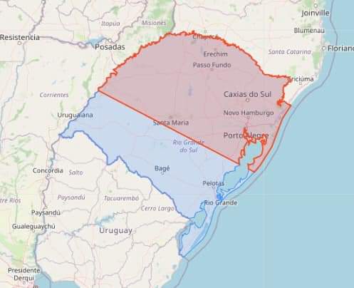 Defesa civil alerta para chuva forte e rajadas de vento na área em vermelho no mapa