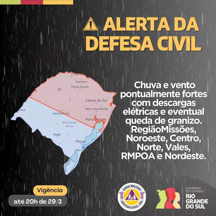 A Defesa Civil do Rio Grande do Sul emitiu um alerta para a região de São Marcos, com previsão de chuvas e ventos pontualmente fortes, acompanhados de descargas elétricas e eventual queda de granizo. O aviso é válido até as 20h desta sexta-feira, dia 29 de março.