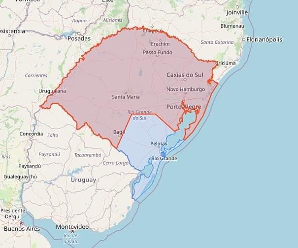Na tarde desta segunda-feira (2) a Defesa Civil do Rio Grande do Sul alerta para chuvas volumosas e risco de transbordamento de rios nas áreas em vermelho no mapa.