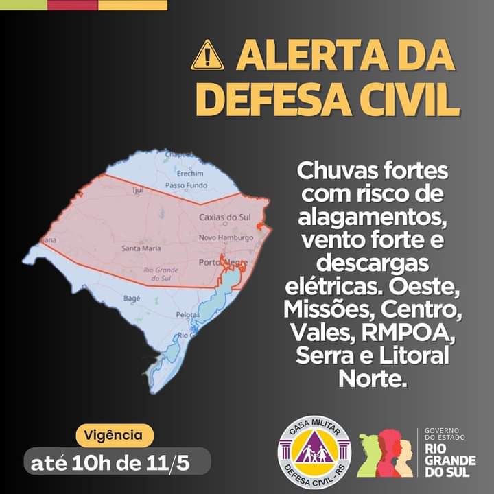 O alerta vale até as 10 horas deste sábado A Defesa Civil emitiu um alerta para a ocorrência de chuvas fortes, com risco de alagamentos, vento forte e descargas elétricas, válido até as 10h do sábado na região Oeste, Missões, Centro, Vales, Região Metropolitana de Porto Alegre, Serra e Litoral Norte.
