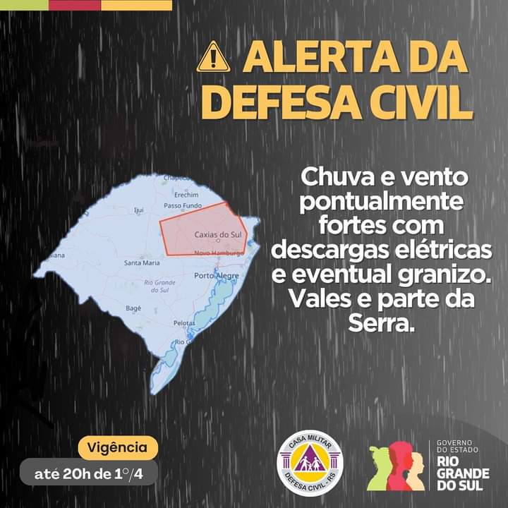 Por volta das 18 horas de hoje a Defesa Civil do Rio Grande do Sul emitiu um alerta para a região, avisando sobre a previsão de chuvas e ventos pontualmente fortes, acompanhados de descargas elétricas e eventual queda de granizo. O aviso está válido até as 20h desta segunda-feira (01/04).