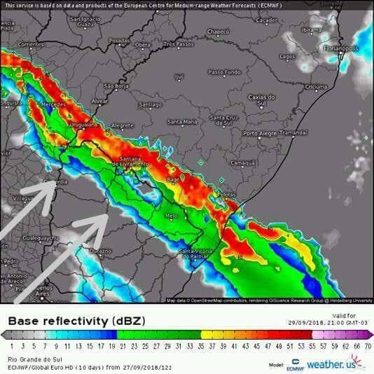 A Defesa Civil do Rio Grande do Sul emitiu alerta de chuvas intensas, tempestade, possibilidade de granizo e eventuais alagamentos em todo Estado do RS, nos dias 29 e 30 de setembro 2018. Neste sábado, a temperatura sobe e uma linha de temporais avançam do oeste e em toda a extensão da fronteira com o Uruguai. As rajadas de vento podem ultrapassar os 80 km/h.