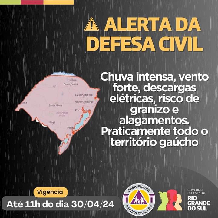 O aviso vale até as 11 horas desta terça-feira A Defesa Civil emitiu um alerta para chuvas intensas, ventos fortes, descargas elétricas, risco de granizo e alagamentos válido até as 11h de terça-feira, 30 de abril, abrangendo praticamente todo o Estado.